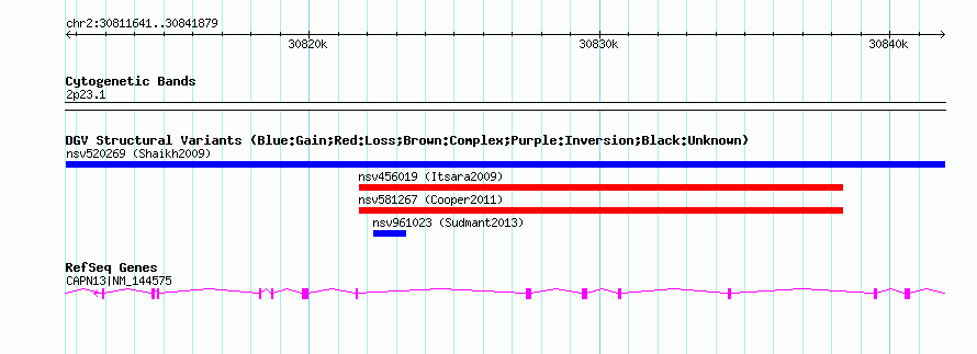| Variant Type | CNV gain | Copy Number | | Allele State | | Allele Origin | | Probe Count | | Validation Flag | | Merged Status | M | Merged Variants | | Supporting Variants | nssv662275, nssv681873 | Samples | | Known Genes | CAPN13 | Method | SNP array | Analysis | Sample-level CNVs | Platform | GPL6434 | Comments | | Reference | Shaikh_et_al_2009 | Pubmed ID | 19592680 | Accession Number(s) | nsv520269
