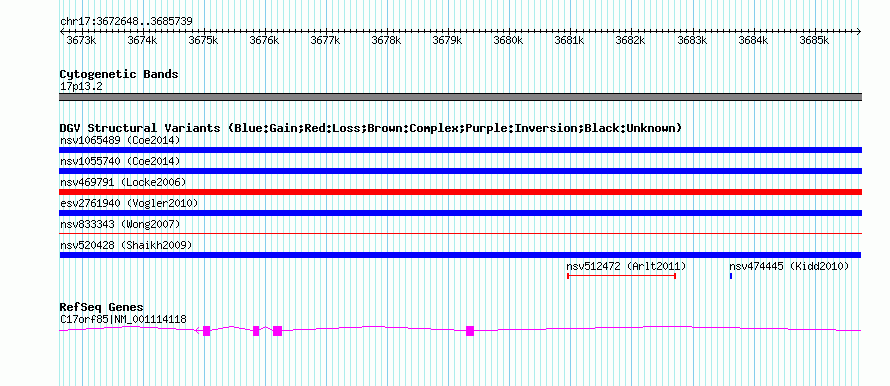 Variant DetailsVariant: nsv520428| Internal ID | 15447721 | | Landmark | | | Location Information | | | Cytoband | 17p13.2 | | Allele length | | Assembly | Allele length | | hg38 | 13092 | | hg19 | 13092 | | hg18 | 13092 | | hg17 | 13092 |