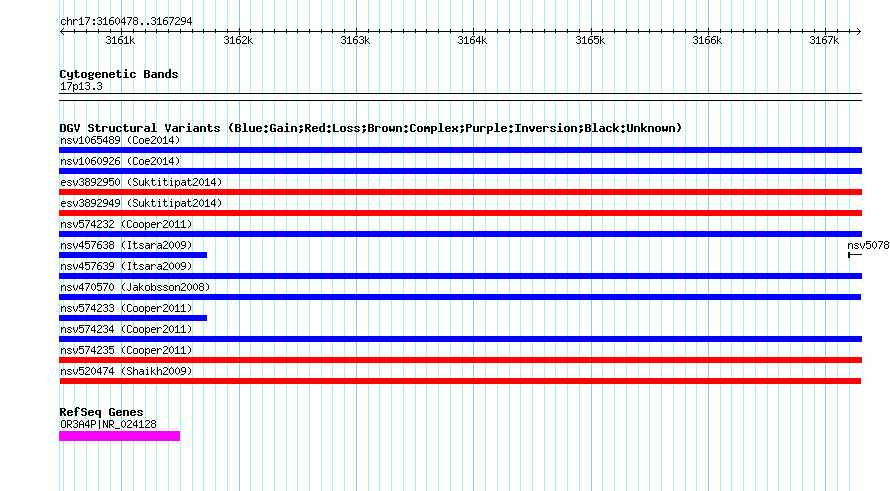 Variant DetailsVariant: nsv520474| Internal ID | 15447767 | | Landmark | | | Location Information | | | Cytoband | 17p13.3 | | Allele length | | Assembly | Allele length | | hg38 | 6817 | | hg19 | 6817 | | hg18 | 6817 | | hg17 | 6817 |