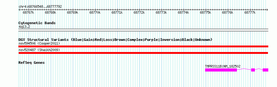 Variant DetailsVariant: nsv520487| Internal ID | 15447780 | | Landmark | | | Location Information | | | Cytoband | 4q13.2 | | Allele length | | Assembly | Allele length | | hg38 | 11245 | | hg19 | 11245 | | hg18 | 11245 | | hg17 | 11245 |