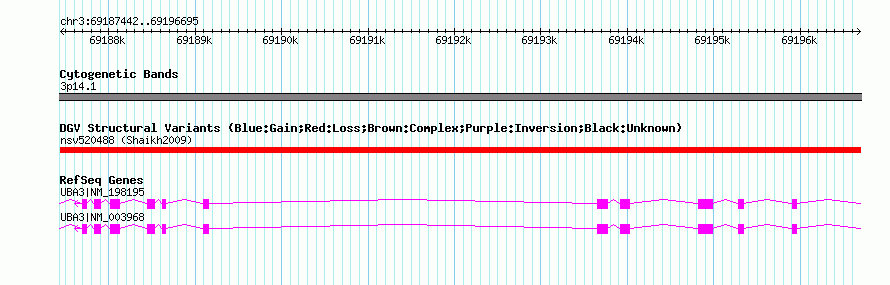 | | Variant Type | CNV loss | | Copy Number | | | Allele State | | | Allele Origin | | | Probe Count | | | Validation Flag | | | Merged Status | M | | Merged Variants | | | Supporting Variants | nssv671813, nssv687300 | | Samples | | | Known Genes | UBA3 | | Method | SNP array | | Analysis | Sample-level CNVs | | Platform | GPL6434 | | Comments | | | Reference | Shaikh_et_al_2009 | | Pubmed ID | 19592680 | | Accession Number(s) | nsv520488
