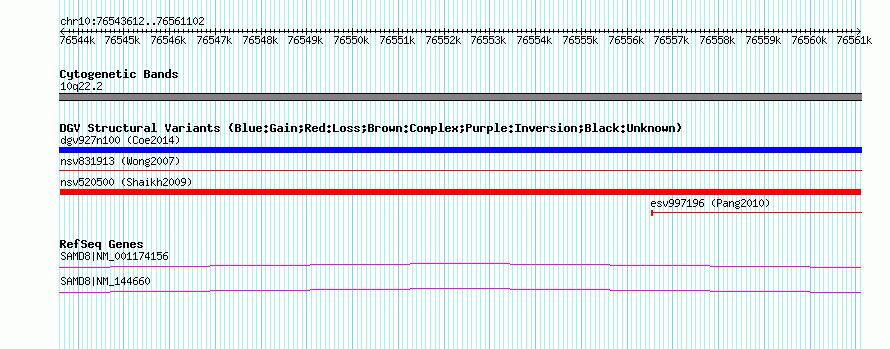| | Variant Type | CNV loss | | Copy Number | | | Allele State | | | Allele Origin | | | Probe Count | | | Validation Flag | | | Merged Status | M | | Merged Variants | | | Supporting Variants | nssv690672, nssv671887 | | Samples | | | Known Genes | SAMD8 | | Method | SNP array | | Analysis | Sample-level CNVs | | Platform | GPL6434 | | Comments | | | Reference | Shaikh_et_al_2009 | | Pubmed ID | 19592680 | | Accession Number(s) | nsv520500
