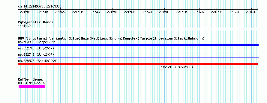 Variant DetailsVariant: nsv520576| Internal ID | 15101183 | | Landmark | | | Location Information | | | Cytoband | 14q11.2 | | Allele length | | Assembly | Allele length | | hg38 | 13814 | | hg19 | 13811 | | hg18 | 13811 | | hg17 | 13811 |