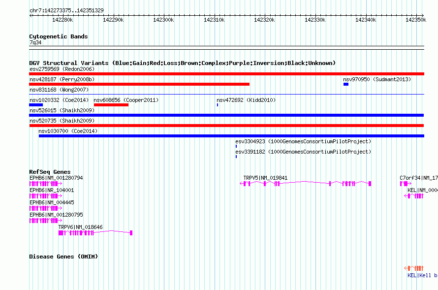 | Variant Type | CNV loss | Copy Number | | Allele State | | Allele Origin | | Probe Count | | Validation Flag | | Merged Status | M | Merged Variants | | Supporting Variants | nssv679629, nssv674860 | Samples | | Known Genes | C7orf34, EPHB6, KEL, TRPV5, TRPV6 | Method | SNP array | Analysis | Sample-level CNVs | Platform | GPL6434 | Comments | | Reference | Shaikh_et_al_2009 | Pubmed ID | 19592680 | Accession Number(s) | nsv520735
