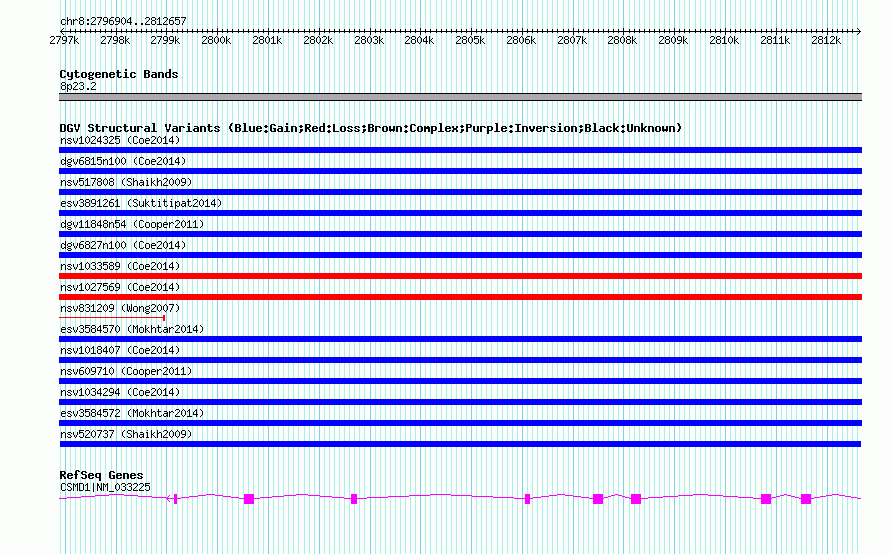 | Variant Type | CNV gain | Copy Number | | Allele State | | Allele Origin | | Probe Count | | Validation Flag | | Merged Status | M | Merged Variants | | Supporting Variants | nssv674863, nssv692906 | Samples | | Known Genes | CSMD1 | Method | SNP array | Analysis | Sample-level CNVs | Platform | GPL6434 | Comments | | Reference | Shaikh_et_al_2009 | Pubmed ID | 19592680 | Accession Number(s) | nsv520737