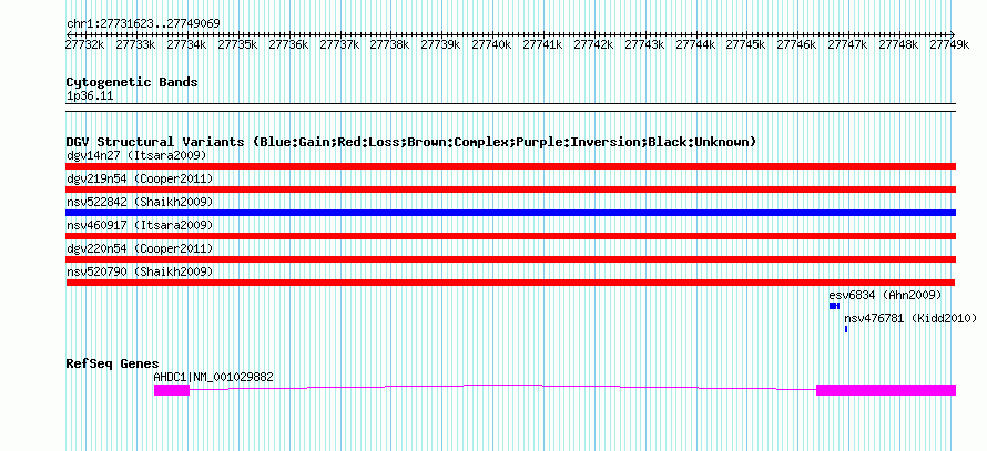 Variant DetailsVariant: nsv520790| Internal ID | 15448083 | | Landmark | | | Location Information | | | Cytoband | 1p36.11 | | Allele length | | Assembly | Allele length | | hg38 | 17447 | | hg19 | 17447 | | hg18 | 17447 | | hg17 | 17447 |