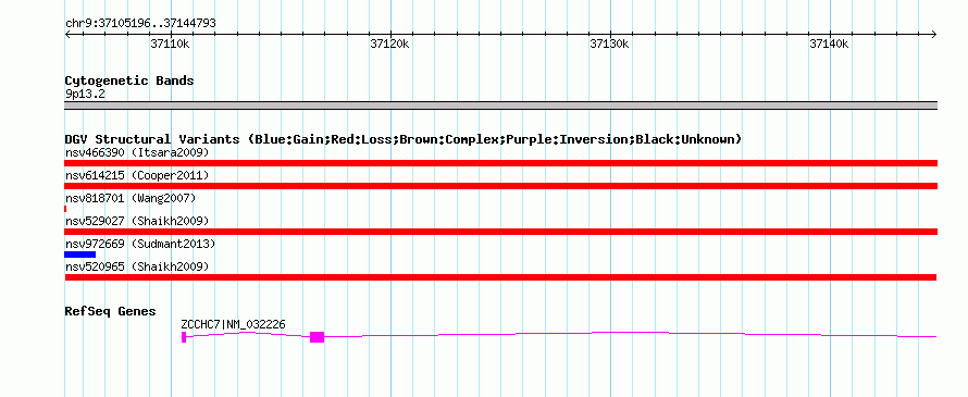 | Variant Type | CNV loss | Copy Number | | Allele State | | Allele Origin | | Probe Count | | Validation Flag | | Merged Status | M | Merged Variants | | Supporting Variants | nssv678920, nssv681030 | Samples | | Known Genes | ZCCHC7 | Method | SNP array | Analysis | Sample-level CNVs | Platform | GPL6434 | Comments | | Reference | Shaikh_et_al_2009 | Pubmed ID | 19592680 | Accession Number(s) | nsv520965