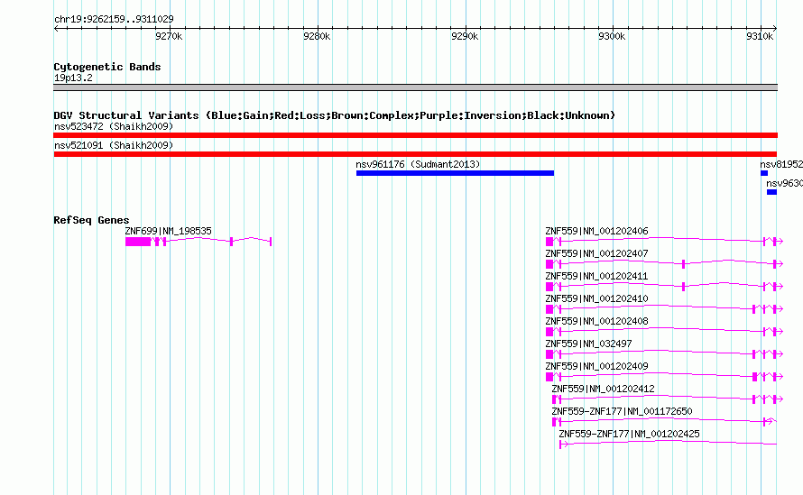 | Variant Type | CNV loss | Copy Number | | Allele State | | Allele Origin | | Probe Count | | Validation Flag | | Merged Status | M | Merged Variants | | Supporting Variants | nssv689798, nssv681893, nssv694451 | Samples | | Known Genes | ZNF559, ZNF559-ZNF177, ZNF699 | Method | SNP array | Analysis | Sample-level CNVs | Platform | GPL6434 | Comments | | Reference | Shaikh_et_al_2009 | Pubmed ID | 19592680 | Accession Number(s) | nsv521091