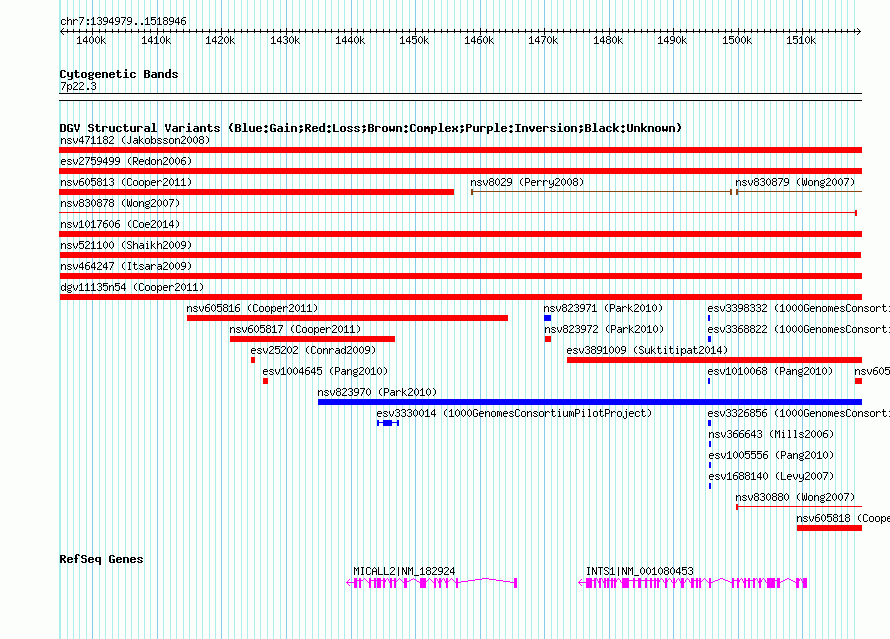 Variant DetailsVariant: nsv521100| Internal ID | 15448393 | | Landmark | | | Location Information | | | Cytoband | 7p22.3 | | Allele length | | Assembly | Allele length | | hg38 | 123968 | | hg19 | 123968 | | hg18 | 123968 | | hg17 | 123968 |
