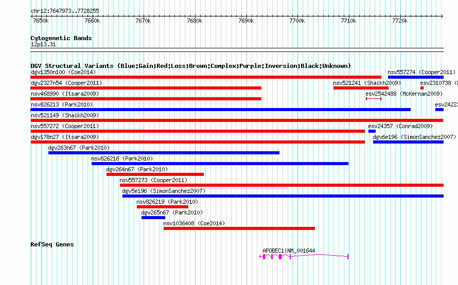 Variant DetailsVariant: nsv521149| Internal ID | 15448442 | | Landmark | | | Location Information | | | Cytoband | 12p13.31 | | Allele length | | Assembly | Allele length | | hg38 | 80283 | | hg19 | 80283 | | hg18 | 80283 | | hg17 | 80283 |
