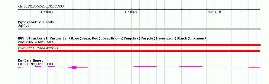 | | Variant Type | CNV loss | | Copy Number | | | Allele State | | | Allele Origin | | | Probe Count | | | Validation Flag | | | Merged Status | M | | Merged Variants | | | Supporting Variants | nssv693471, nssv685250 | | Samples | | | Known Genes | COL6A6 | | Method | SNP array | | Analysis | Sample-level CNVs | | Platform | GPL6434 | | Comments | | | Reference | Shaikh_et_al_2009 | | Pubmed ID | 19592680 | | Accession Number(s) | nsv521211