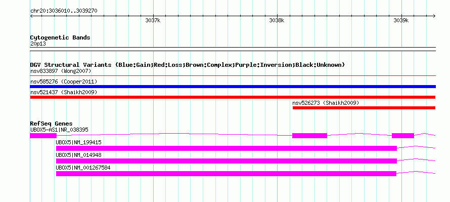 | Variant Type | CNV loss | Copy Number | | Allele State | | Allele Origin | | Probe Count | | Validation Flag | | Merged Status | M | Merged Variants | | Supporting Variants | nssv698047 | Samples | | Known Genes | UBOX5, UBOX5-AS1 | Method | SNP array | Analysis | Sample-level CNVs | Platform | GPL6434 | Comments | | Reference | Shaikh_et_al_2009 | Pubmed ID | 19592680 | Accession Number(s) | nsv521437