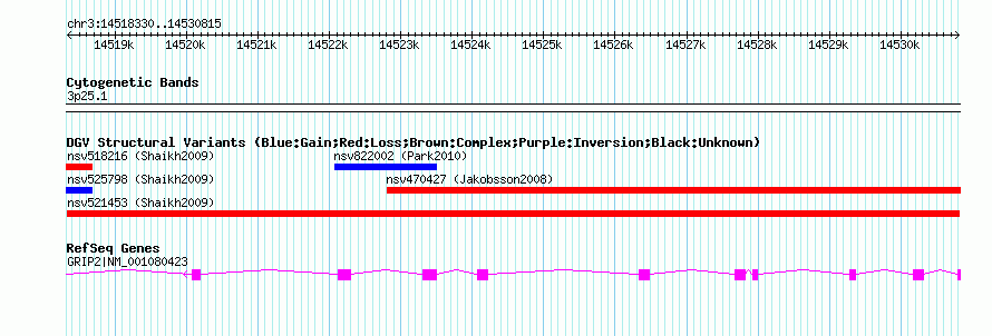Variant DetailsVariant: nsv521453| Internal ID | 15102060 | | Landmark | | | Location Information | | | Cytoband | 3p25.1 | | Allele length | | Assembly | Allele length | | hg38 | 12486 | | hg19 | 12486 | | hg18 | 12486 | | hg17 | 12486 |