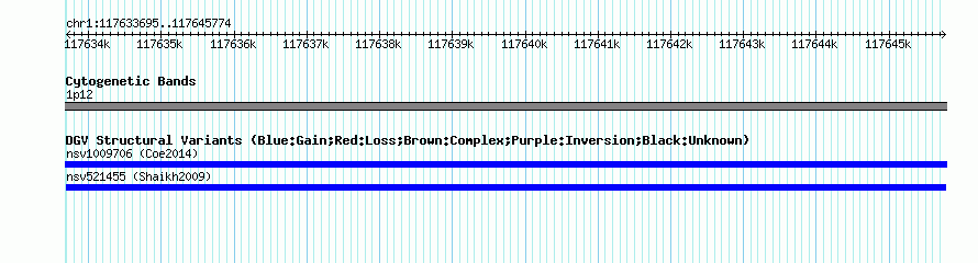 Variant DetailsVariant: nsv521455| Internal ID | 15448748 | | Landmark | | | Location Information | | | Cytoband | 1p12 | | Allele length | | Assembly | Allele length | | hg38 | 12080 | | hg19 | 12080 | | hg18 | 12080 | | hg17 | 12080 |
