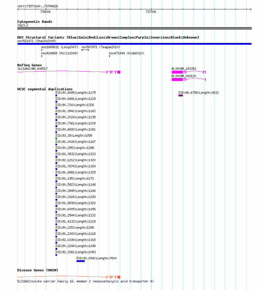 | | Variant Type | CNV gain | | Copy Number | | | Allele State | | | Allele Origin | | | Probe Count | | | Validation Flag | | | Merged Status | M | | Merged Variants | | | Supporting Variants | nssv698083 | | Samples | | | Known Genes | RLIM, SLC16A2 | | Method | SNP array | | Analysis | Sample-level CNVs | | Platform | GPL6434 | | Comments | | | Reference | Shaikh_et_al_2009 | | Pubmed ID | 19592680 | | Accession Number(s) | nsv521472
