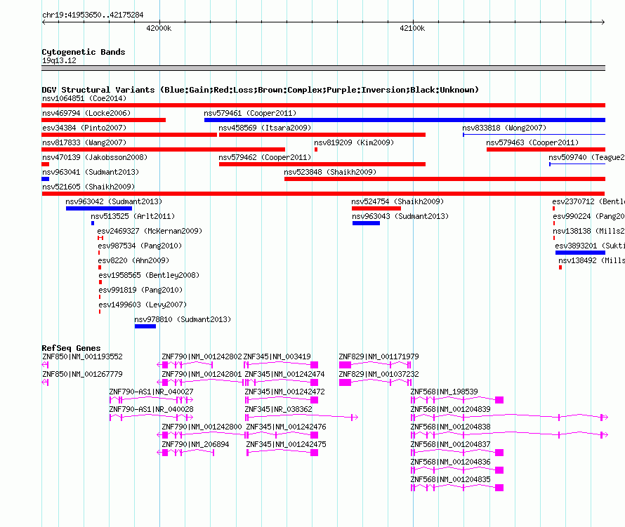 | | Variant Type | CNV loss | | Copy Number | | | Allele State | | | Allele Origin | | | Probe Count | | | Validation Flag | | | Merged Status | M | | Merged Variants | | | Supporting Variants | nssv698221 | | Samples | | | Known Genes | ZNF345, ZNF568, ZNF790, ZNF790-AS1, ZNF829, ZNF850 | | Method | SNP array | | Analysis | Sample-level CNVs | | Platform | GPL6434 | | Comments | | | Reference | Shaikh_et_al_2009 | | Pubmed ID | 19592680 | | Accession Number(s) | nsv521605