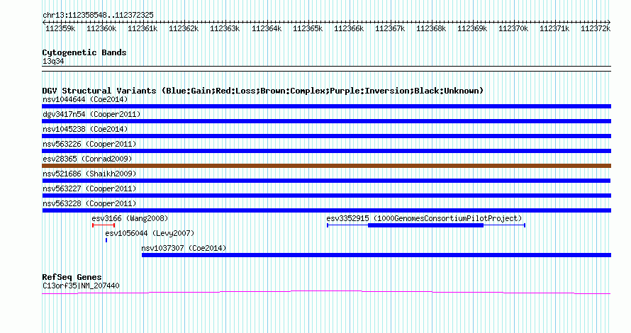 Variant DetailsVariant: nsv521686| Internal ID | 15448979 | | Landmark | | | Location Information | | | Cytoband | 13q34 | | Allele length | | Assembly | Allele length | | hg38 | 13778 | | hg19 | 13778 | | hg18 | 13778 | | hg17 | 13778 |
