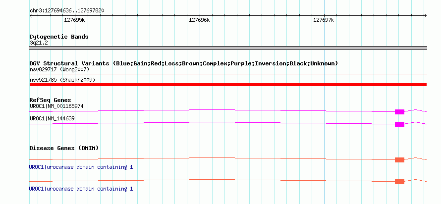 | Variant Type | CNV loss | Copy Number | | Allele State | | Allele Origin | | Probe Count | | Validation Flag | | Merged Status | M | Merged Variants | | Supporting Variants | nssv694097 | Samples | | Known Genes | UROC1 | Method | SNP array | Analysis | Sample-level CNVs | Platform | GPL6434 | Comments | | Reference | Shaikh_et_al_2009 | Pubmed ID | 19592680 | Accession Number(s) | nsv521785