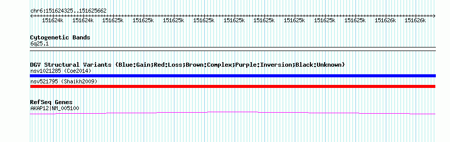 | Variant Type | CNV loss | Copy Number | | Allele State | | Allele Origin | | Probe Count | | Validation Flag | | Merged Status | M | Merged Variants | | Supporting Variants | nssv694566 | Samples | | Known Genes | AKAP12 | Method | SNP array | Analysis | Sample-level CNVs | Platform | GPL6434 | Comments | | Reference | Shaikh_et_al_2009 | Pubmed ID | 19592680 | Accession Number(s) | nsv521795