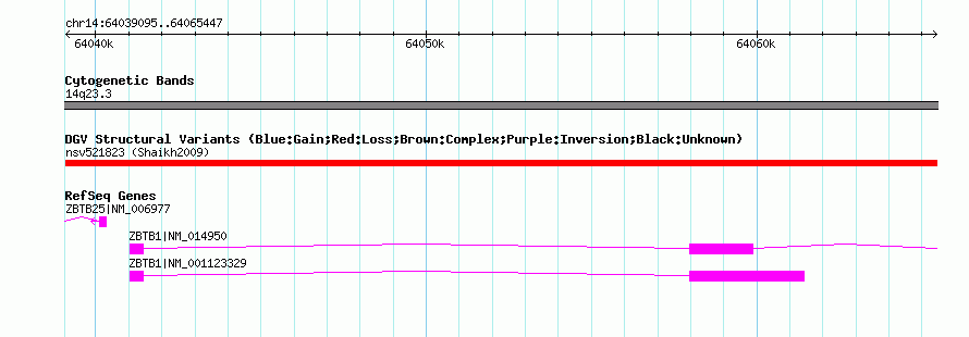 | Variant Type | CNV loss | Copy Number | | Allele State | | Allele Origin | | Probe Count | | Validation Flag | | Merged Status | M | Merged Variants | | Supporting Variants | nssv694595 | Samples | | Known Genes | ZBTB1, ZBTB25 | Method | SNP array | Analysis | Sample-level CNVs | Platform | GPL6434 | Comments | | Reference | Shaikh_et_al_2009 | Pubmed ID | 19592680 | Accession Number(s) | nsv521823