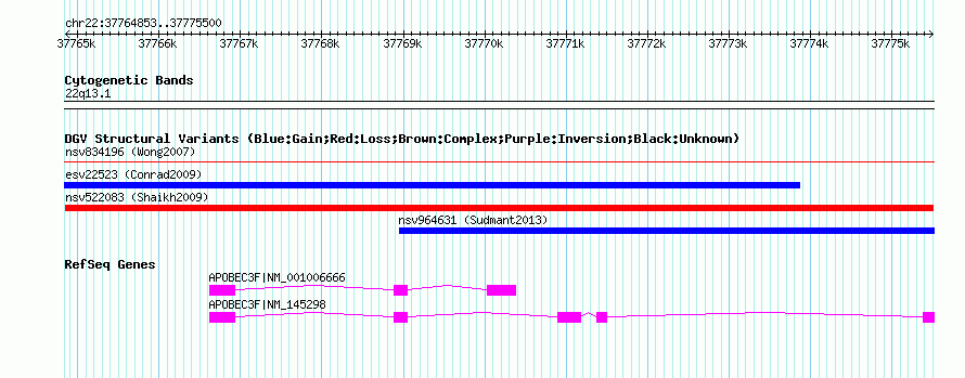 Variant DetailsVariant: nsv522083| Internal ID | 15449376 | | Landmark | | | Location Information | | | Cytoband | 22q13.1 | | Allele length | | Assembly | Allele length | | hg38 | 10648 | | hg19 | 10648 | | hg18 | 10648 | | hg17 | 10648 |