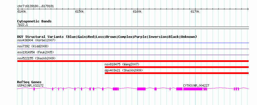 |  | Variant Type | CNV loss |  | Copy Number |  |  | Allele State |  |  | Allele Origin |  |  | Probe Count |  |  | Validation Flag |  |  | Merged Status | M |  | Merged Variants |  |  | Supporting Variants | nssv694928 |  | Samples |  |  | Known Genes | CYTH3, USP42 |  | Method | SNP array |  | Analysis | Sample-level CNVs |  | Platform | GPL6434 |  | Comments |  |  | Reference | Shaikh_et_al_2009 |  | Pubmed ID | 19592680 |  | Accession Number(s) | nsv522155