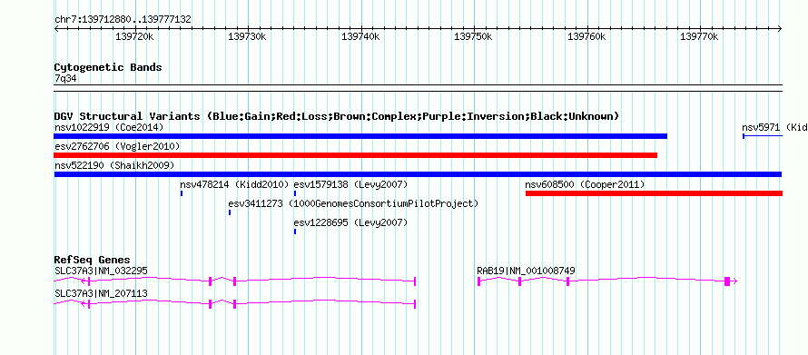 Variant DetailsVariant: nsv522190| Internal ID | 15449483 | | Landmark | | | Location Information | | | Cytoband | 7q34 | | Allele length | | Assembly | Allele length | | hg38 | 64253 | | hg19 | 64253 | | hg18 | 64253 | | hg17 | 64253 |