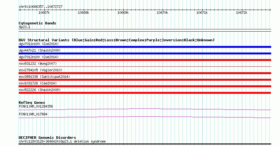Variant DetailsVariant: nsv522226| Internal ID | 15449519 | | Landmark | | | Location Information | | | Cytoband | 8p23.1 | | Allele length | | Assembly | Allele length | | hg38 | 6371 | | hg19 | 6371 | | hg18 | 6371 | | hg17 | 6371 |
