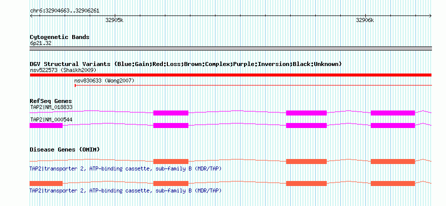 | Variant Type | CNV loss | Copy Number | | Allele State | | Allele Origin | | Probe Count | | Validation Flag | | Merged Status | M | Merged Variants | | Supporting Variants | nssv705957 | Samples | | Known Genes | TAP2 | Method | SNP array | Analysis | Sample-level CNVs | Platform | GPL6434 | Comments | | Reference | Shaikh_et_al_2009 | Pubmed ID | 19592680 | Accession Number(s) | nsv522573