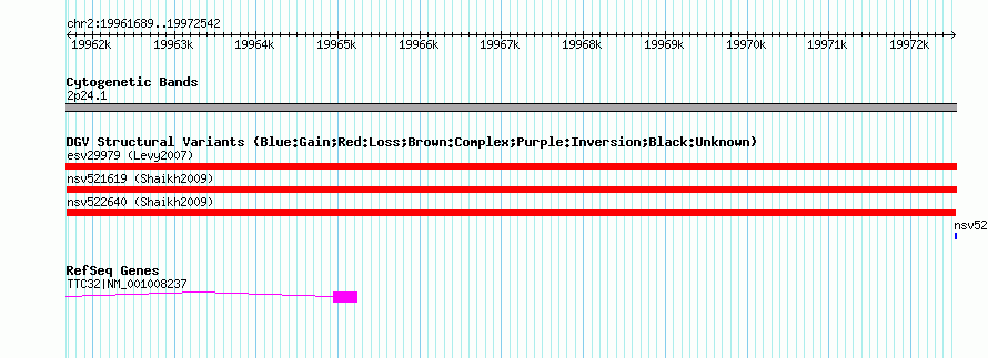 | Variant Type | CNV loss | Copy Number | | Allele State | | Allele Origin | | Probe Count | | Validation Flag | | Merged Status | M | Merged Variants | | Supporting Variants | nssv706038 | Samples | | Known Genes | TTC32 | Method | SNP array | Analysis | Sample-level CNVs | Platform | GPL6434 | Comments | | Reference | Shaikh_et_al_2009 | Pubmed ID | 19592680 | Accession Number(s) | nsv522640