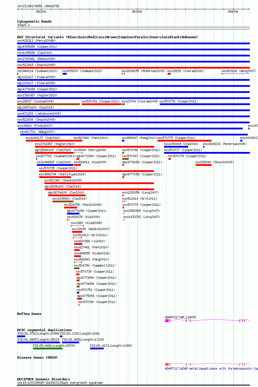 | Variant Type | CNV gain | Copy Number | | Allele State | | Allele Origin | | Probe Count | | Validation Flag | | Merged Status | M | Merged Variants | | Supporting Variants | nssv698485 | Samples | | Known Genes | ADAMTS17 | Method | SNP array | Analysis | Sample-level CNVs | Platform | GPL6434 | Comments | | Reference | Shaikh_et_al_2009 | Pubmed ID | 19592680 | Accession Number(s) | nsv522834