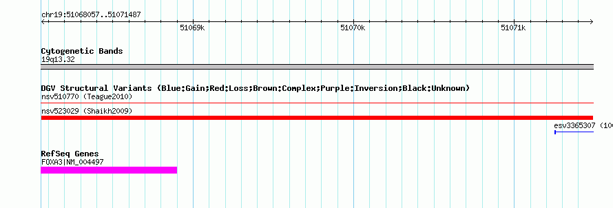|  | Variant Type | CNV loss |  | Copy Number |  |  | Allele State |  |  | Allele Origin |  |  | Probe Count |  |  | Validation Flag |  |  | Merged Status | M |  | Merged Variants |  |  | Supporting Variants | nssv698710 |  | Samples |  |  | Known Genes | FOXA3 |  | Method | SNP array |  | Analysis | Sample-level CNVs |  | Platform | GPL6434 |  | Comments |  |  | Reference | Shaikh_et_al_2009 |  | Pubmed ID | 19592680 |  | Accession Number(s) | nsv523029