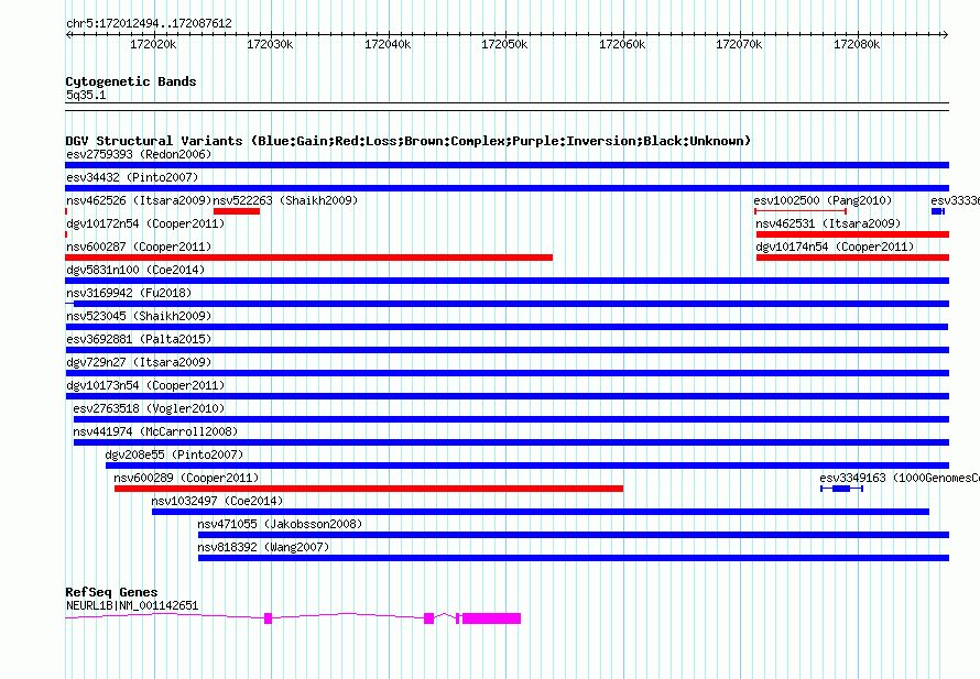 Variant DetailsVariant: nsv523045| Internal ID | 15450338 | | Landmark | | | Location Information | | | Cytoband | 5q35.1 | | Allele length | | Assembly | Allele length | | hg38 | 75119 | | hg19 | 75119 | | hg18 | 75119 | | hg17 | 75119 |