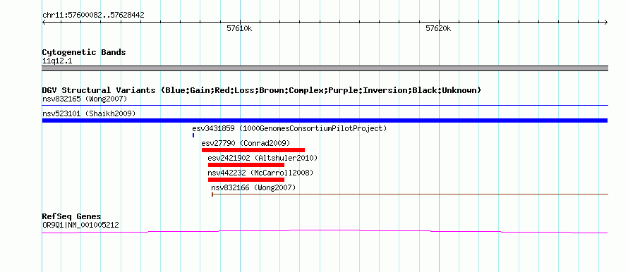Variant DetailsVariant: nsv523101| Internal ID | 15103708 | | Landmark | | | Location Information | | | Cytoband | 11q12.1 | | Allele length | | Assembly | Allele length | | hg38 | 28361 | | hg19 | 28361 | | hg18 | 28361 | | hg17 | 28361 |