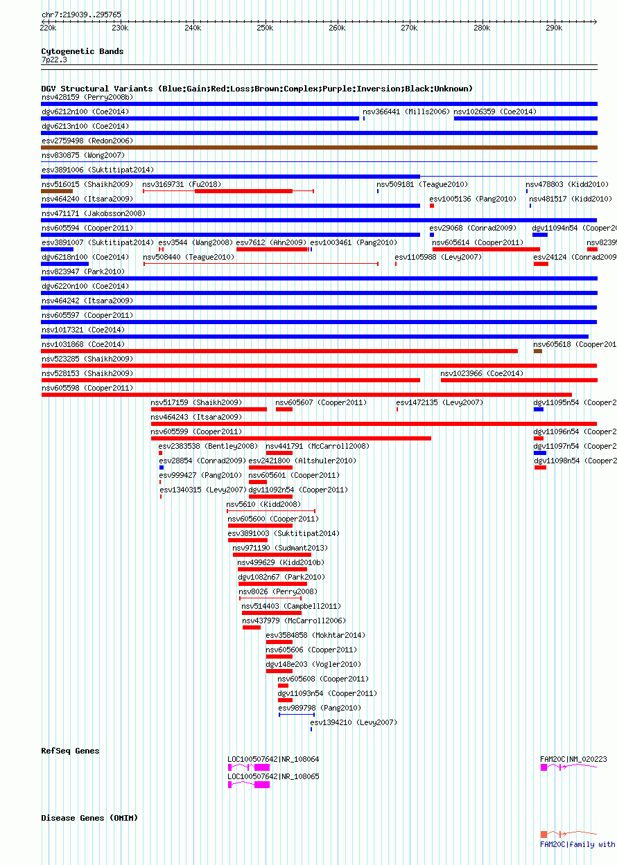 Variant DetailsVariant: nsv523285| Internal ID | 15450578 | | Landmark | | | Location Information | | | Cytoband | 7p22.3 | | Allele length | | Assembly | Allele length | | hg38 | 76727 | | hg19 | 76727 | | hg18 | 76727 | | hg17 | 76727 |