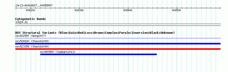 Variant DetailsVariant: nsv523358| Internal ID | 15450651 | | Landmark | | | Location Information | | | Cytoband | 13q14.11 | | Allele length | | Assembly | Allele length | | hg38 | 42121 | | hg19 | 42121 | | hg18 | 42121 | | hg17 | 42121 |