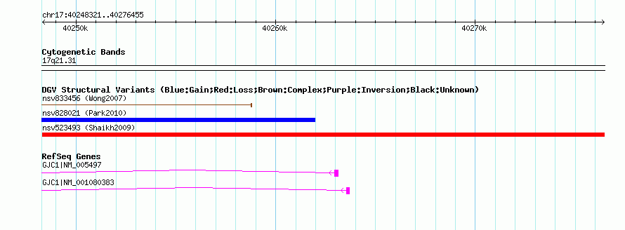 Variant DetailsVariant: nsv523493Internal ID | 15104100 | Landmark | | Location Information | | Cytoband | 17q21.31 | Allele length | Assembly | Allele length | hg38 | 28135 | hg19 | 28135 | hg18 | 28135 | hg17 | 28135 |