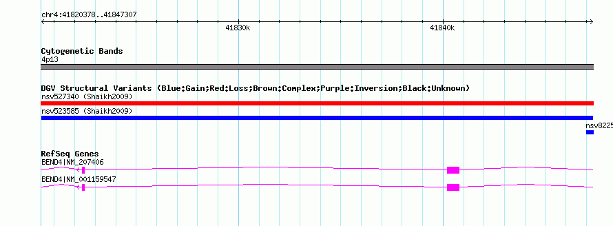 Variant DetailsVariant: nsv523585| Internal ID | 15104192 | | Landmark | | | Location Information | | | Cytoband | 4p13 | | Allele length | | Assembly | Allele length | | hg38 | 26930 | | hg19 | 26930 | | hg18 | 26930 | | hg17 | 26930 |