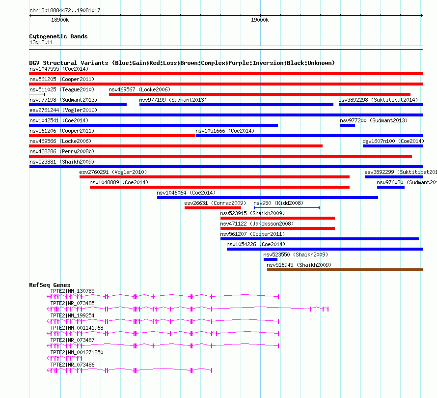 Variant DetailsVariant: nsv523881| Internal ID | 15451174 | | Landmark | | | Location Information | | | Cytoband | 13q12.11 | | Allele length | | Assembly | Allele length | | hg38 | 196546 | | hg19 | 196546 | | hg18 | 196546 | | hg17 | 196546 |