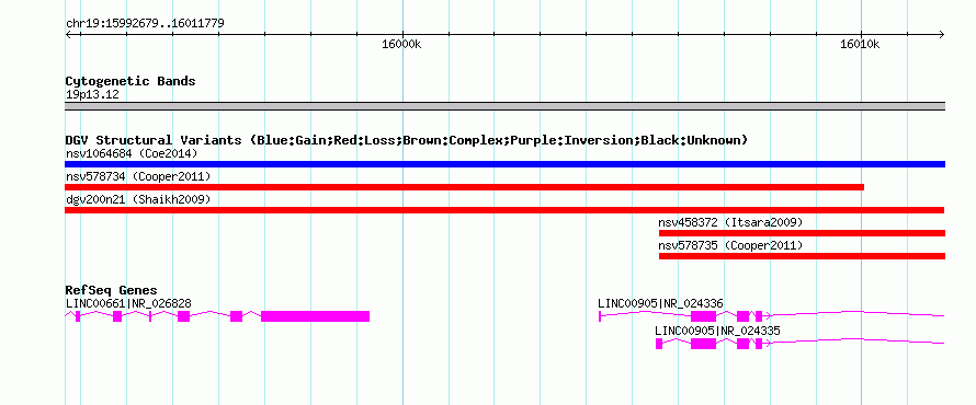 Variant DetailsVariant: nsv524067Internal ID | 15104674 | Landmark | | Location Information | | Cytoband | 19p13.12 | Allele length | Assembly | Allele length | hg38 | 19101 | hg19 | 19101 | hg18 | 19101 | hg17 | 19101 |