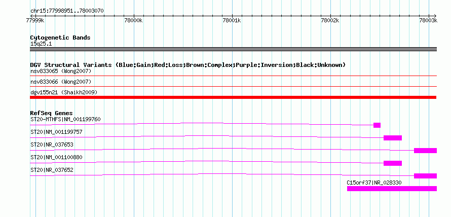 | | Variant Type | CNV loss | | Copy Number | | | Allele State | | | Allele Origin | | | Probe Count | | | Validation Flag | | | Merged Status | M | | Merged Variants | dgv155n21 | | Supporting Variants | nssv700081 | | Samples | | | Known Genes | C15orf37, ST20, ST20-MTHFS | | Method | SNP array | | Analysis | Sample-level CNVs | | Platform | GPL6434 | | Comments | | | Reference | Shaikh_et_al_2009 | | Pubmed ID | 19592680 | | Accession Number(s) | nsv524197