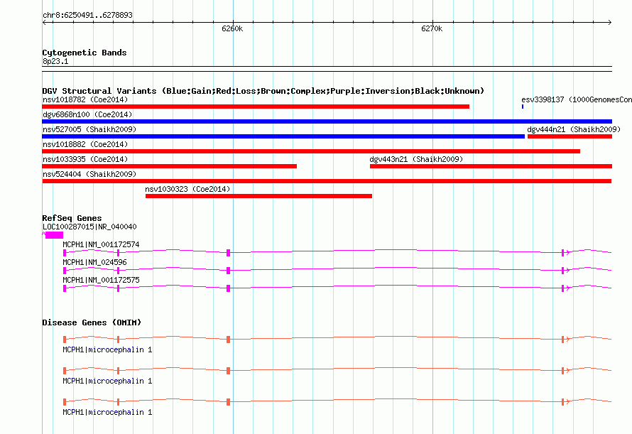 | | Variant Type | CNV loss | | Copy Number | | | Allele State | | | Allele Origin | | | Probe Count | | | Validation Flag | | | Merged Status | M | | Merged Variants | | | Supporting Variants | nssv700323 | | Samples | | | Known Genes | LOC100287015, MCPH1 | | Method | SNP array | | Analysis | Sample-level CNVs | | Platform | GPL6434 | | Comments | | | Reference | Shaikh_et_al_2009 | | Pubmed ID | 19592680 | | Accession Number(s) | nsv524404