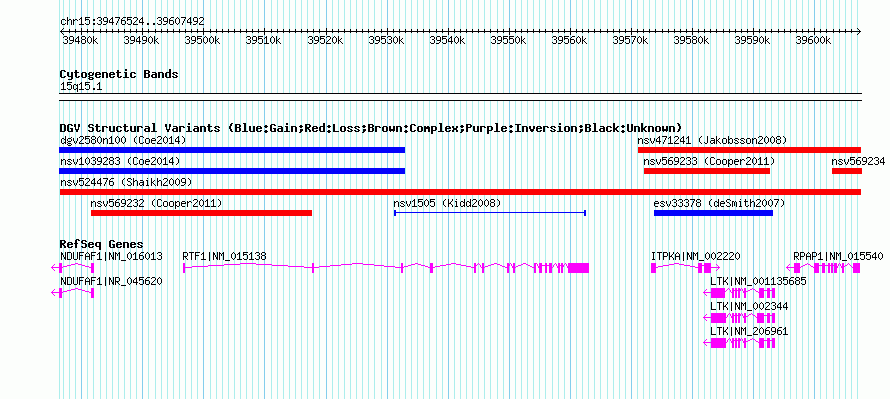 | | Variant Type | CNV loss | | Copy Number | | | Allele State | | | Allele Origin | | | Probe Count | | | Validation Flag | | | Merged Status | M | | Merged Variants | | | Supporting Variants | nssv700414 | | Samples | | | Known Genes | ITPKA, LTK, NDUFAF1, RPAP1, RTF1 | | Method | SNP array | | Analysis | Sample-level CNVs | | Platform | GPL6434 | | Comments | | | Reference | Shaikh_et_al_2009 | | Pubmed ID | 19592680 | | Accession Number(s) | nsv524476