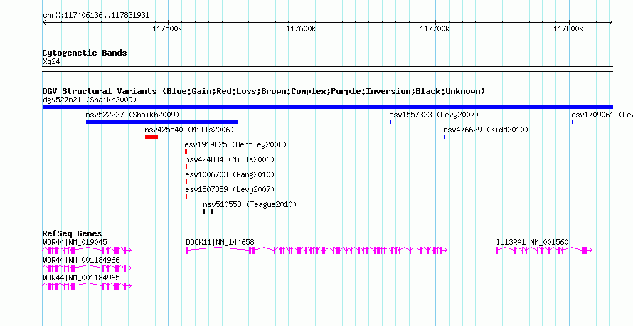 Variant DetailsVariant: nsv524583| Internal ID | 15451876 | | Landmark | | | Location Information | | | Cytoband | Xq24 | | Allele length | | Assembly | Allele length | | hg38 | 425796 | | hg19 | 425796 | | hg18 | 425796 | | hg17 | 425796 |