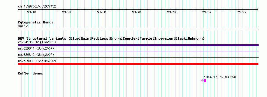 Variant DetailsVariant: nsv525088| Internal ID | 15452381 | | Landmark | | | Location Information | | | Cytoband | 4p16.1 | | Allele length | | Assembly | Allele length | | hg38 | 6843 | | hg19 | 6843 | | hg18 | 6843 | | hg17 | 6843 |