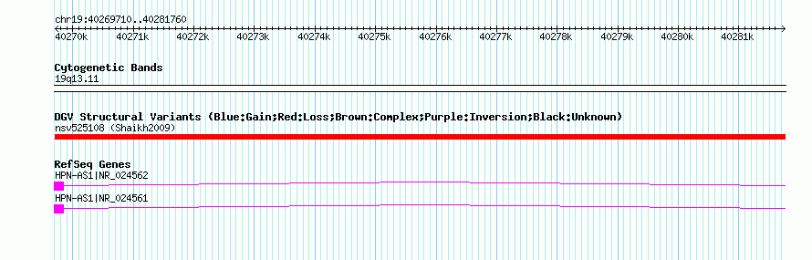 Variant DetailsVariant: nsv525108| Internal ID | 15452401 | | Landmark | | | Location Information | | | Cytoband | 19q13.11 | | Allele length | | Assembly | Allele length | | hg38 | 12051 | | hg19 | 12051 | | hg18 | 12051 | | hg17 | 12051 |
