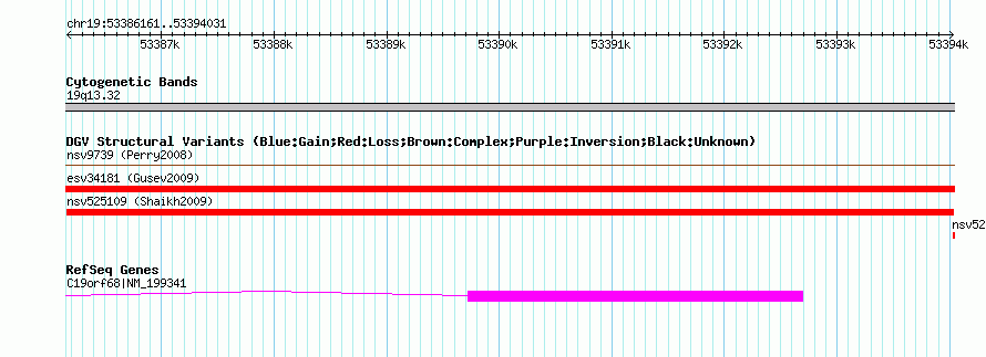 Variant DetailsVariant: nsv525109| Internal ID | 15452402 | | Landmark | | | Location Information | | | Cytoband | 19q13.32 | | Allele length | | Assembly | Allele length | | hg38 | 7871 | | hg19 | 7871 | | hg18 | 7871 | | hg17 | 7871 |