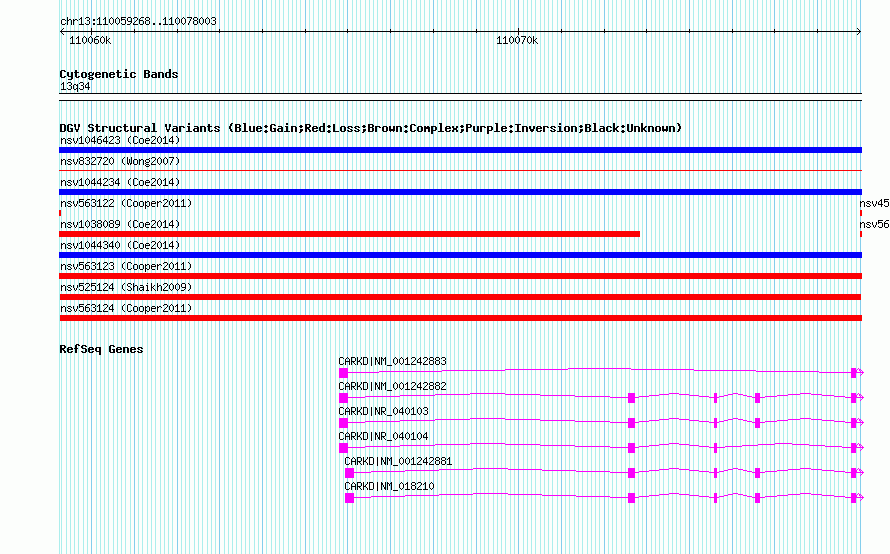 Variant DetailsVariant: nsv525124| Internal ID | 15452417 | | Landmark | | | Location Information | | | Cytoband | 13q34 | | Allele length | | Assembly | Allele length | | hg38 | 18736 | | hg19 | 18736 | | hg18 | 18736 | | hg17 | 18736 |
