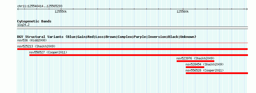 Variant DetailsVariant: nsv525213| Internal ID | 15452506 | | Landmark | | | Location Information | | | Cytoband | 11q24.2 | | Allele length | | Assembly | Allele length | | hg38 | 18880 | | hg19 | 18880 | | hg18 | 18880 | | hg17 | 18880 |