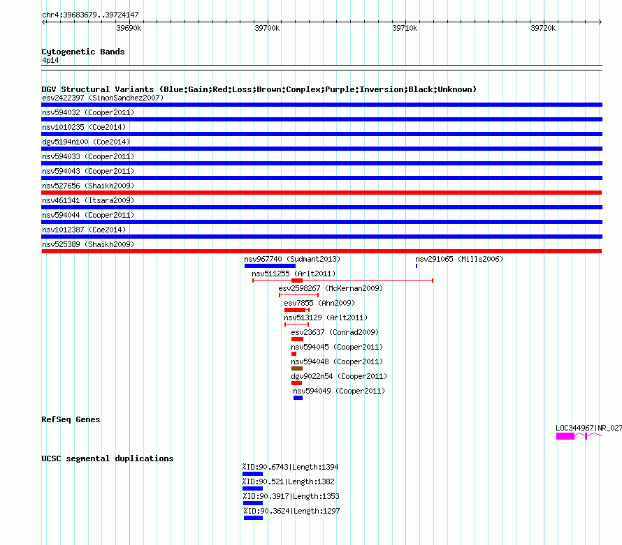 Variant DetailsVariant: nsv525389| Internal ID | 15105996 | | Landmark | | | Location Information | | | Cytoband | 4p14 | | Allele length | | Assembly | Allele length | | hg38 | 40469 | | hg19 | 40469 | | hg18 | 40469 | | hg17 | 40469 |